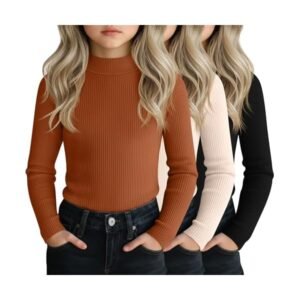 3 Pack Girls’ Mock Turtleneck Shirts Cotton Long Sleeve Ribbed Tops Slim Fit Casual Base Layer for Kids Winter